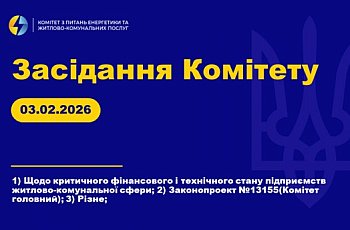 У вівторок 03 лютого 2026 року розпочнеться засідання Комітету з питань енергетики та житлово-комунальних послуг. Початок заплановано на 16:00