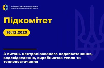 16 грудня 2025 року Голова Підкомітету з питань централізованого водопостачання, водовідведення, виробництва тепла та теплопостачання Євген Пивоваров провів робочу нараду щодо підготовки до другого читання проекту Закону України «Про внесення змін до деяких законів України щодо нарахування плати за житлово-комунальні послуги та обліку збитків у зв’язку з пошкодженням або знищенням об’єктів нерухомого майна» (реєстр. № 13155 від 04.04.2025).